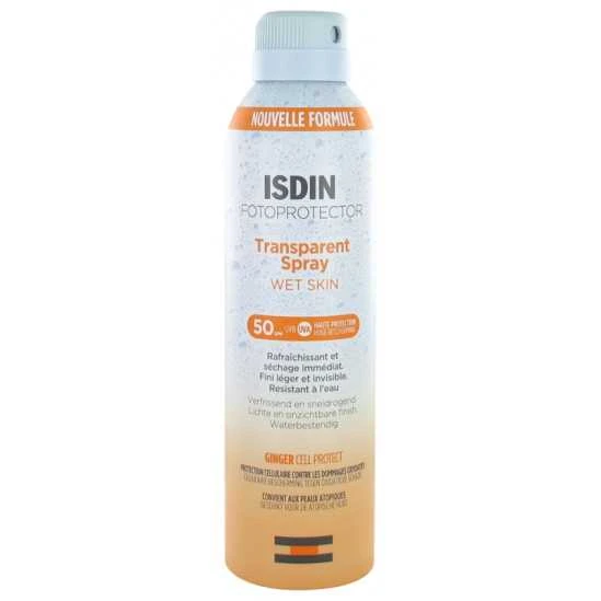 Isdin Fotoprotector Transparent Spray Wet Skin SPF50 250 ml est un spray transparent photoprotecteur à haute protection anti-UVA/UVB, résistant à l’eau.
