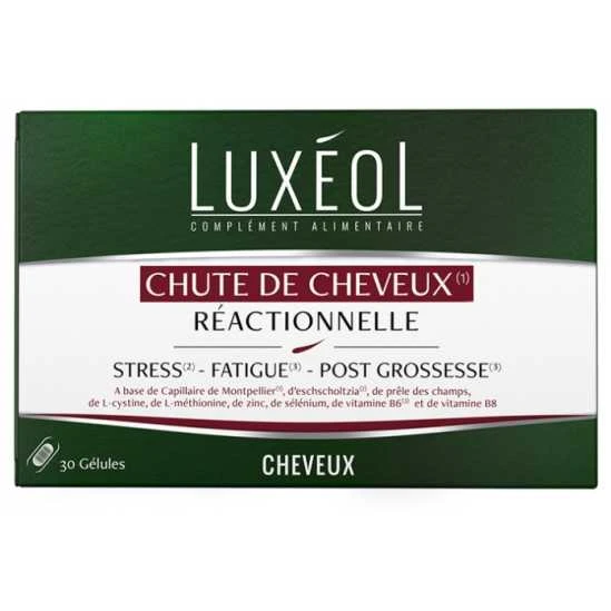 Luxéol Chute de Cheveux Réactionnelle 30 Gélules est un complément alimentaire à base de plantes, L-cystéine, L-méthionine, minéraux et vitamines, pour aider dans le cas de chute de cheveux et aider à les fortifier.