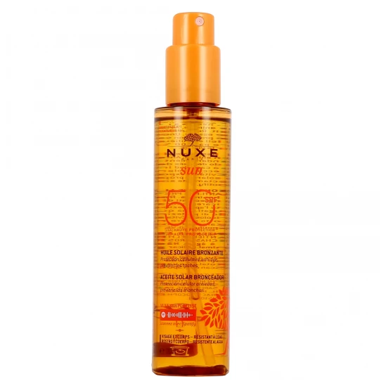 L’huile solaire SPF 50 Nuxe Sun permet de préserver la peau des dommages induits par le soleil : coups de soleil, brûlures, lésions cellulaires et photovieillissement. Elle assure une protection cellulaire anti-âge et la prévention des taches pigmentaires. Sa formule repose sur un complexe filtrant breveté, issu de la recherche Nuxe, qui associe 3 filtres organiques et 2 esters afin de garantir une haute protection à large spectre, efficace sur l’ensemble des UV : UVA courts et longs, UVB. Cette huile bronzante contient également des extraits de riz et romarin qui forment un duo végétal aux vertus antioxydantes pour combattre le stress oxydatif et prévenir le vieillissement cutané prématuré lié au soleil. Leur action est renforcée par la présence de vitamine E. Finalement, l’huile de tournesol apporte ses propriétés nourrissantes et adoucissantes.