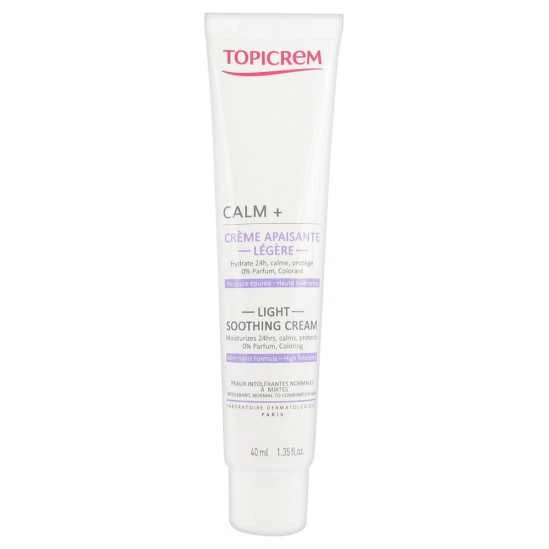 - Topicreme Calm+ Crème Apaisante 40 ml est un soin qui hydrate durant 24 heures les peaux intolérantes normales à mixtes. Sa formule enrichie en insaponifiables d’huile de tournesol d’origine naturelle et huile de prune calme les sensations d’irritations et réduit la sensibilité de la peau. Sa formule épurée (15 ingrédients) offre une haute tolérance.